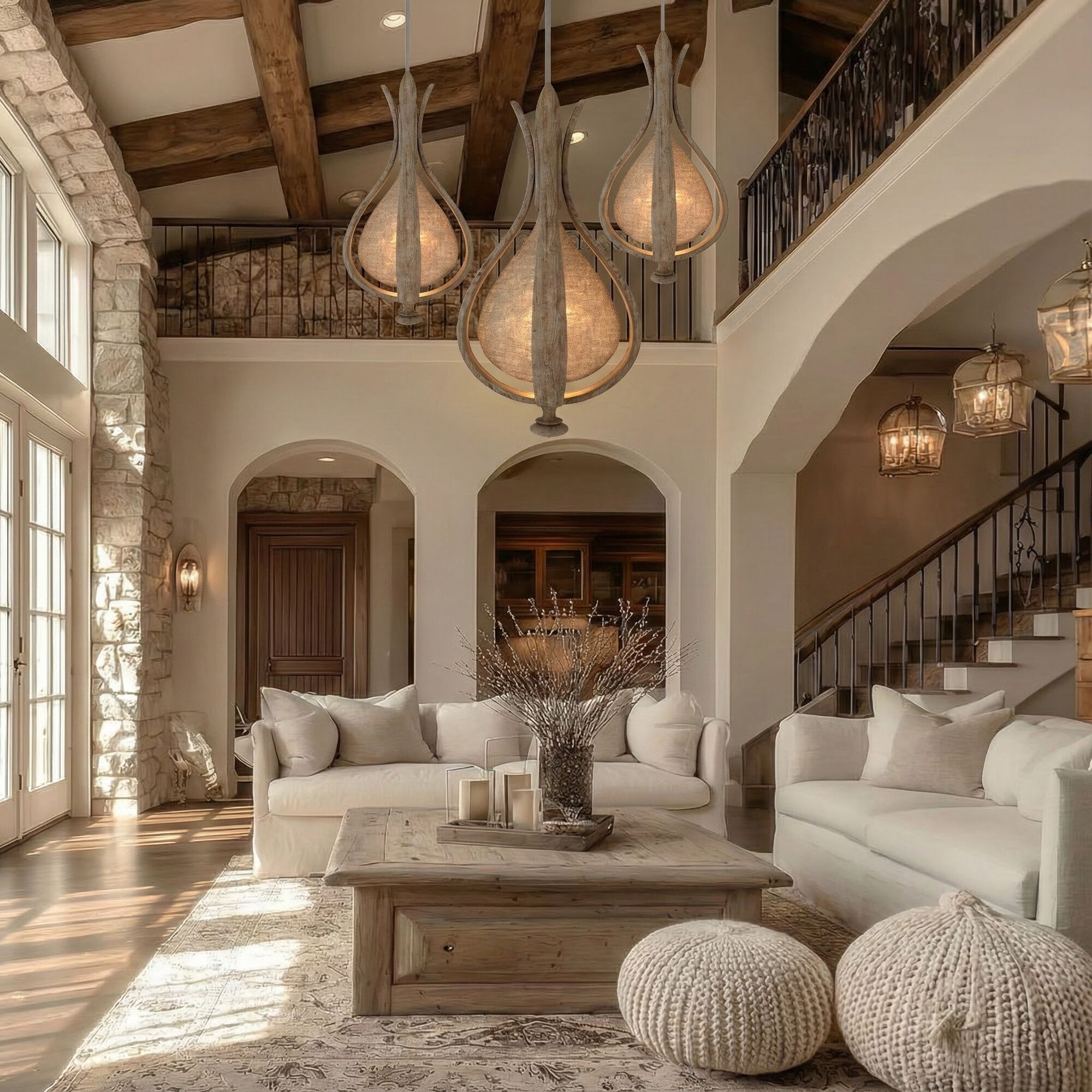 Elevated living requires elevated lighting. We are thrilled to introduce The Tulip Chandelier in its element. Its organic silhouette and weathered wood finish provide the perfect focal point for this rustic-luxe living space, complementing the high ceilings and exposed beams without overpowering them.